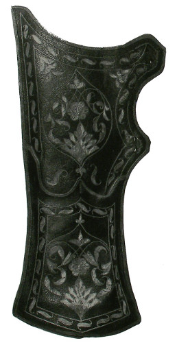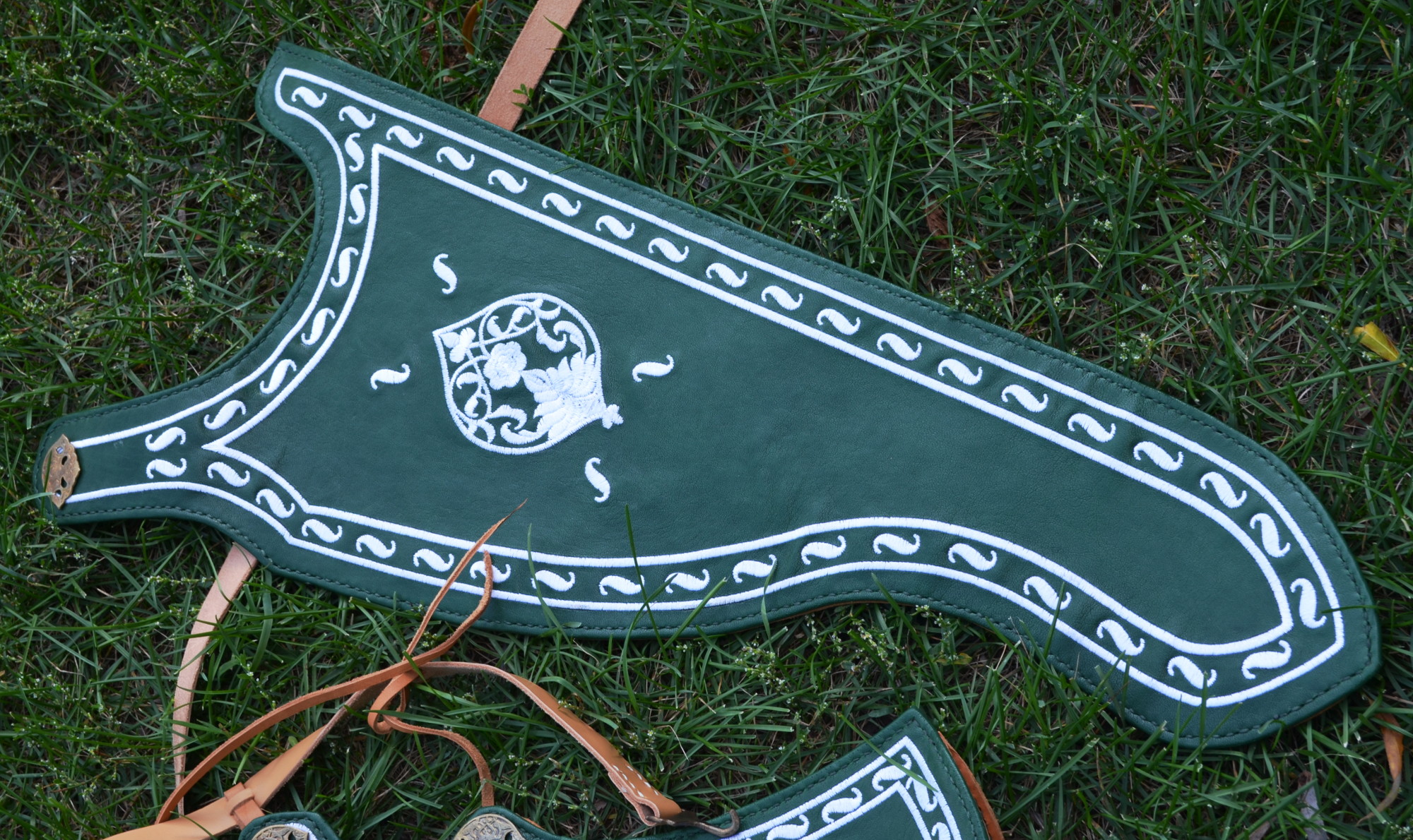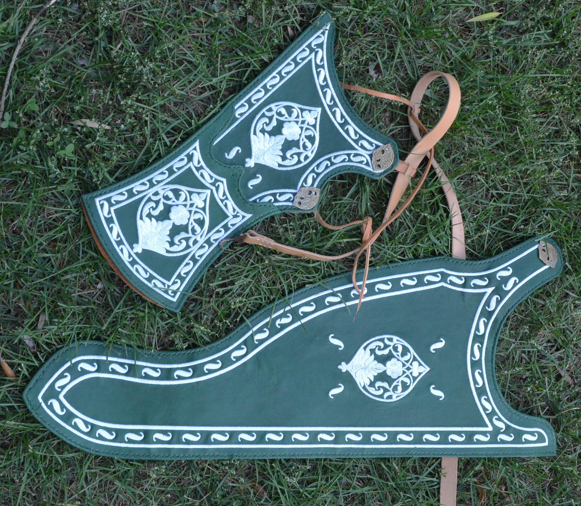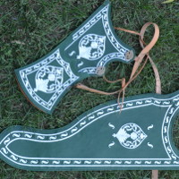 This sajdak is crafted following the pattern of a preserved 17th-century Turkish quiver from the collection of Dresden's "Türkische Kammer" (inventory number D102). The original quiver was adorned with hand embroidery on leather, a technique accurately reproduced using machine embroidery on thin goat leather. The design of the missing bow case was reconstructed based on typical forms for this quiver type, incorporating decorative elements inspired by the original quiver.