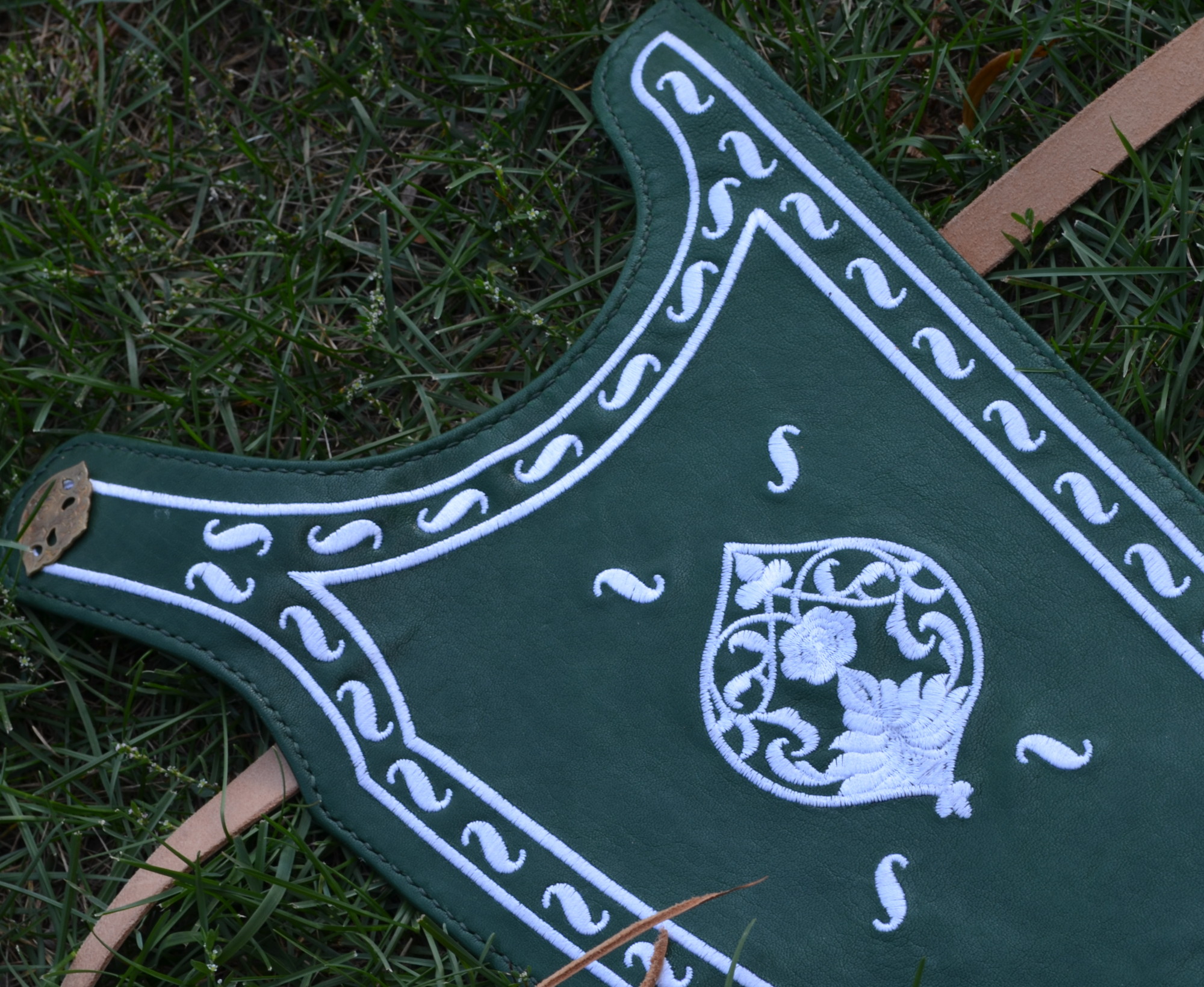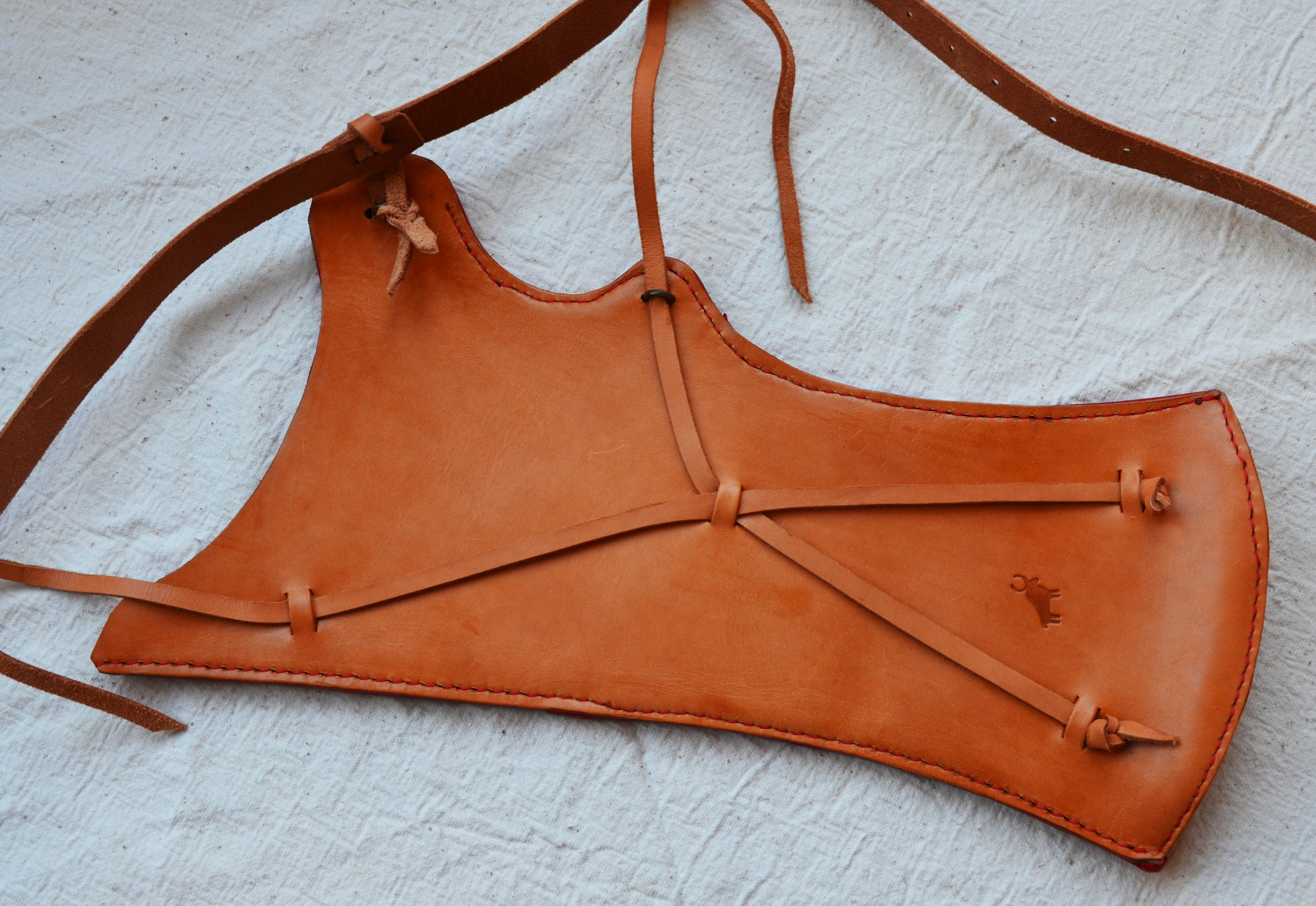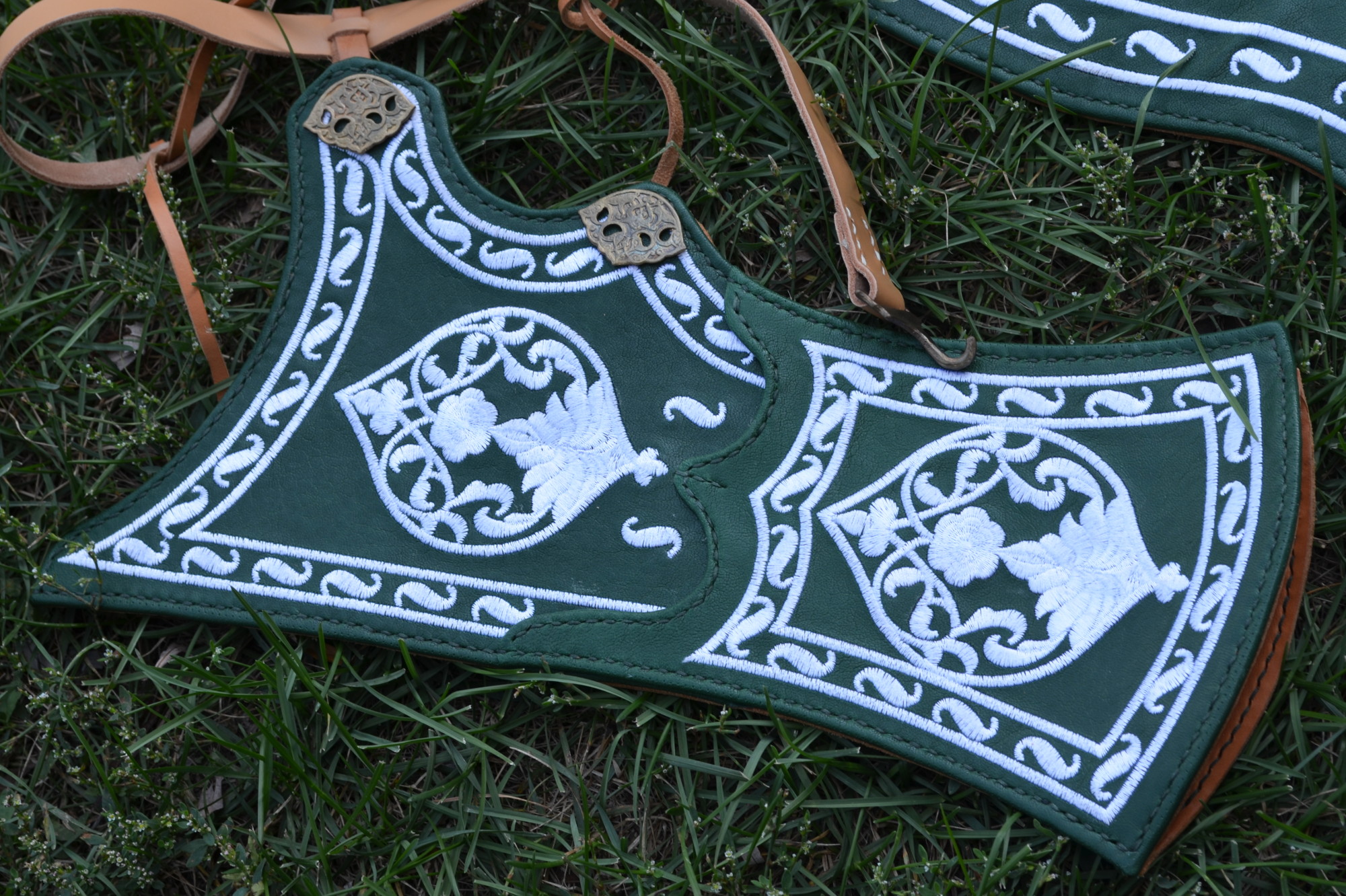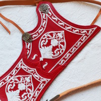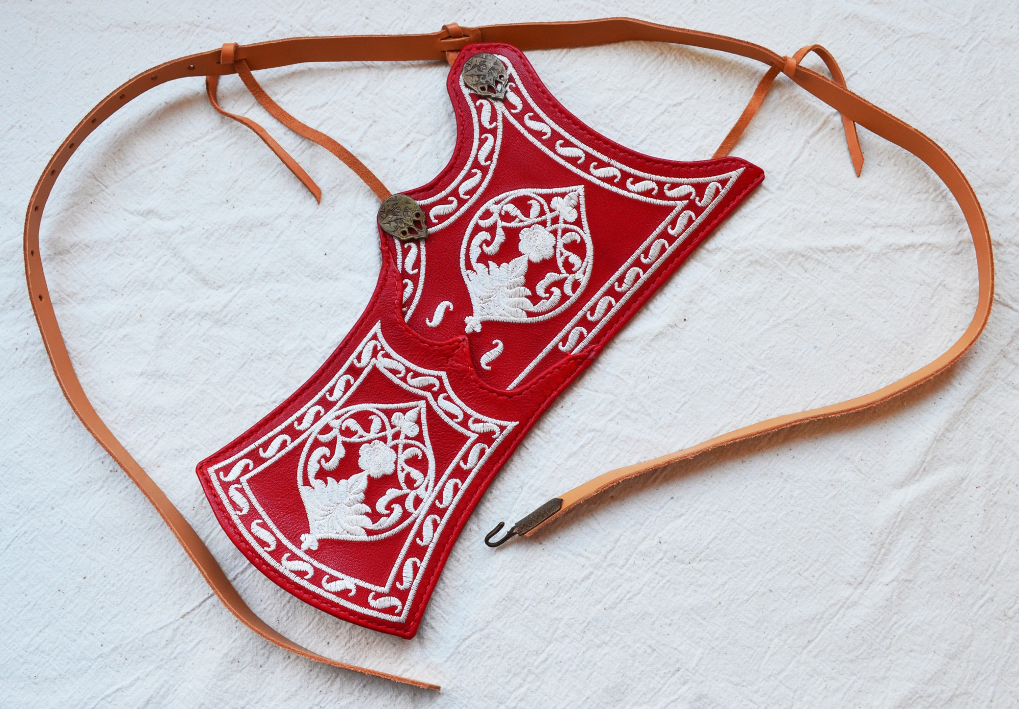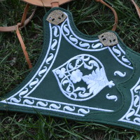 The base of the quiver and bow case is made from 2mm thick vegetable-tanned leather of bovine cattle, with the front side featuring a second layer of thin goat leather with embroidery. The quiver and bow case are fixed to the belt using special mounts, featuring a functional loop on the back. The small straps are secured and adjustable through the slit system on the belt. The entire suspension system is copied from original items currently stored in museums and has been successfully tested in practice. We use historically accurate hook fasteners on the belt. Thanks to them, the quiver can be put on and taken off quickly and conveniently.